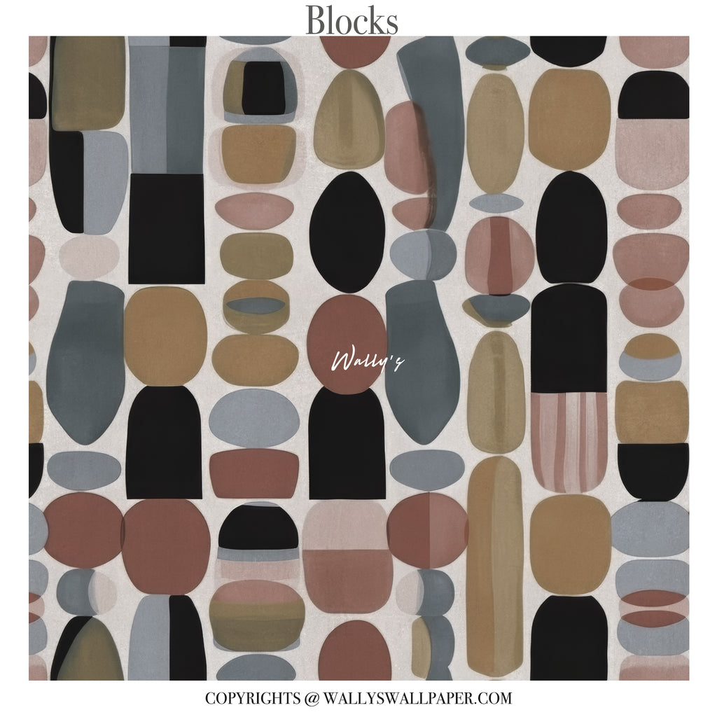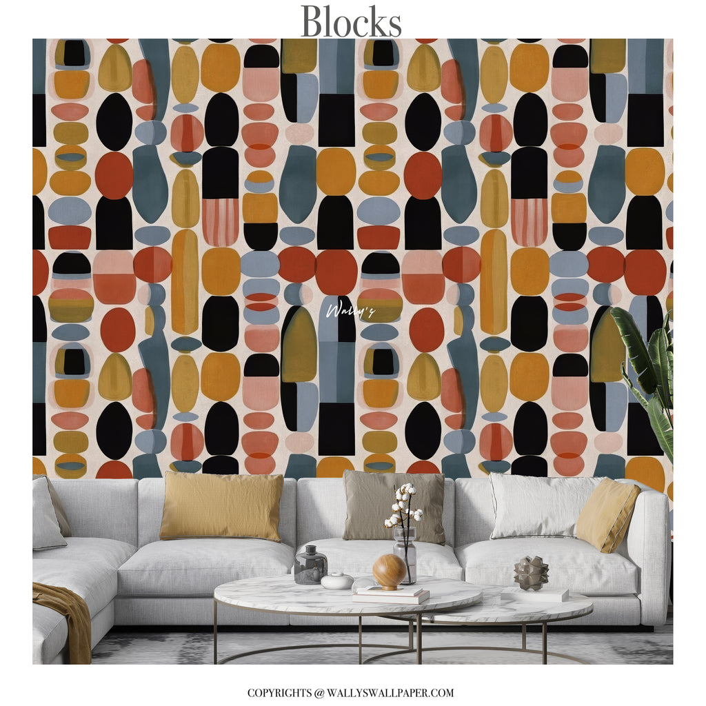 Blocks is a bold abstract geometric wallpaper featuring organic shapes arranged in a rhythmic vertical composition. Inspired by mid-century modern design and contemporary art, this mural combines warm earthy tones with deep contrasting accents to create visual movement and balance.